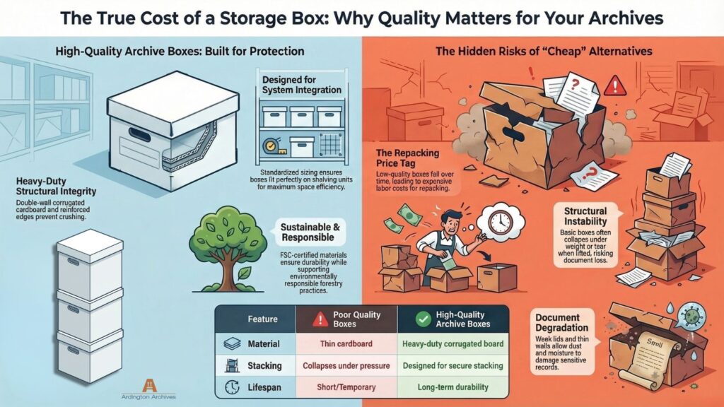 A well-made archive box keeps dust out, maintains the shape of the documents inside, and holds its own structural integrity under the weight of other boxes stacked on top. A poorly made one can warp, split, or simply collapse, leaving files exposed, disordered, or damaged. Neither outcome is acceptable when those records may be needed for an audit, a legal dispute, or a compliance check.